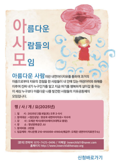 ¾Æ¸§´Ù¿î »ç¶÷À̶õ ³»¸é¾ÆÀÌÄ¡À¯¸¦ ÅëÇÏ¿© °ú°ÅÀÇ ¾ÆÇÄÀ¸·ÎºÎÅÍ Ä¡À¯ÀÇ °æÇèÀ» ÇÑ »ç¶÷µéÀÌ ³» ¾È¿¡ ÀÖ´Â ¾î¸°¾ÆÀÌ¿Í È­ÇØ¸¦ ÀÌ·ç¾î ÁøÂ¥ ³»°¡ ´©±º ÀÎÁö¸¦ ¾Ë°í Áö±Ý ¿©±â¸¦ ÇູÇÏ°Ô »ì¾Æ°¥ ÁÙ ¾Æ´Â ÀÌ ¼¼»ó ´©±¸º¸´Ù ¾Æ¸§´Ù¿î ³ª¸¦ ¹ß°ßÇÑ »ç¶÷µéÀÇ Ä¡À¯°øµ¿Ã¼ÀÇ ¸ðÀÓÀÔ´Ï´Ù.